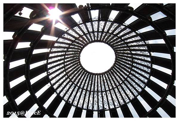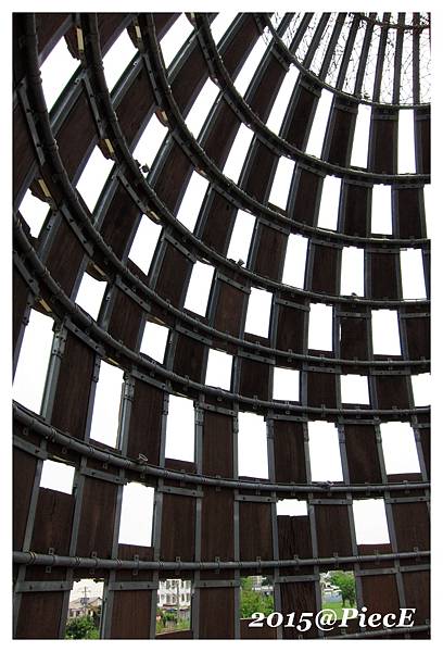 像進入山洞般穿越高塔,象徵著嘉義林業的興盛,以及鐵路的重要性。