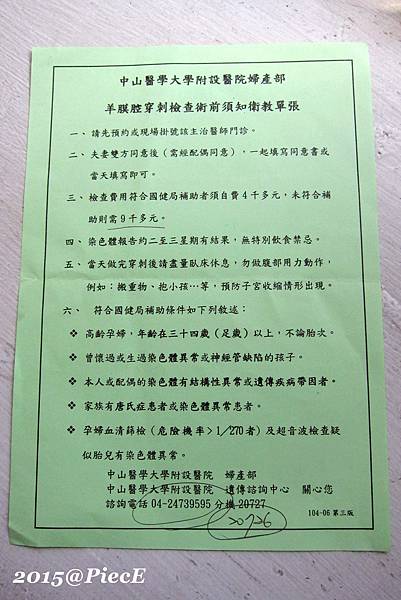 中山醫的衛教室會針對羊膜穿刺的一些風險及所需費用做說明。