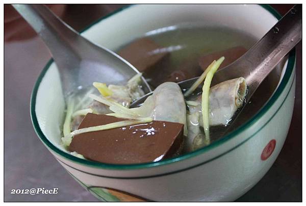 我們各點了一顆肉圓(我點辣,朋友點不辣)及一碗豬血大腸湯(35大洋)。