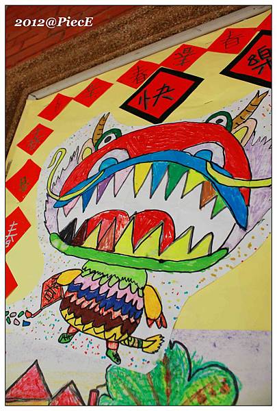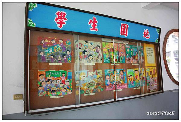 ㄇ型校舍的窗戶及布告欄上貼滿了小朋友的作品,