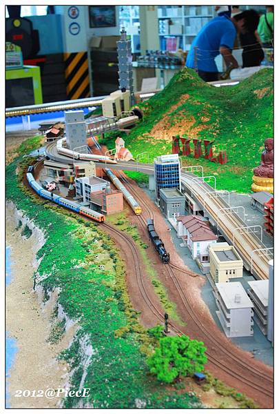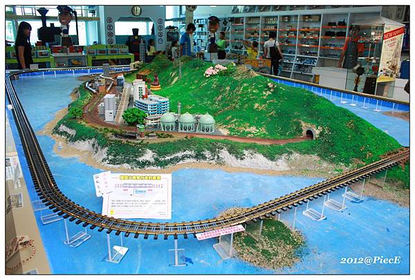 (繞著台灣模型的火車鐵軌,會有火車模型在上面奔跑)