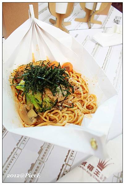朋友點的是「全素蘑菇義大利麵」,而這份餐點的餐具就是用紙製作而成的。