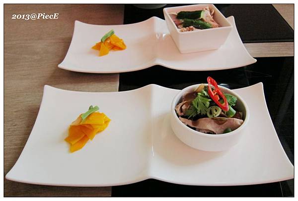 擺盤上橘黃色片狀的部分,是醃製過的南瓜片,