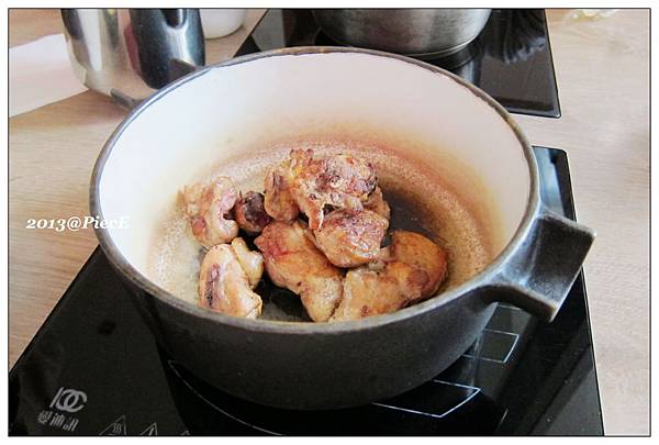 剛端來的是鍋子裡放有已經事先煎過的雞肉塊。